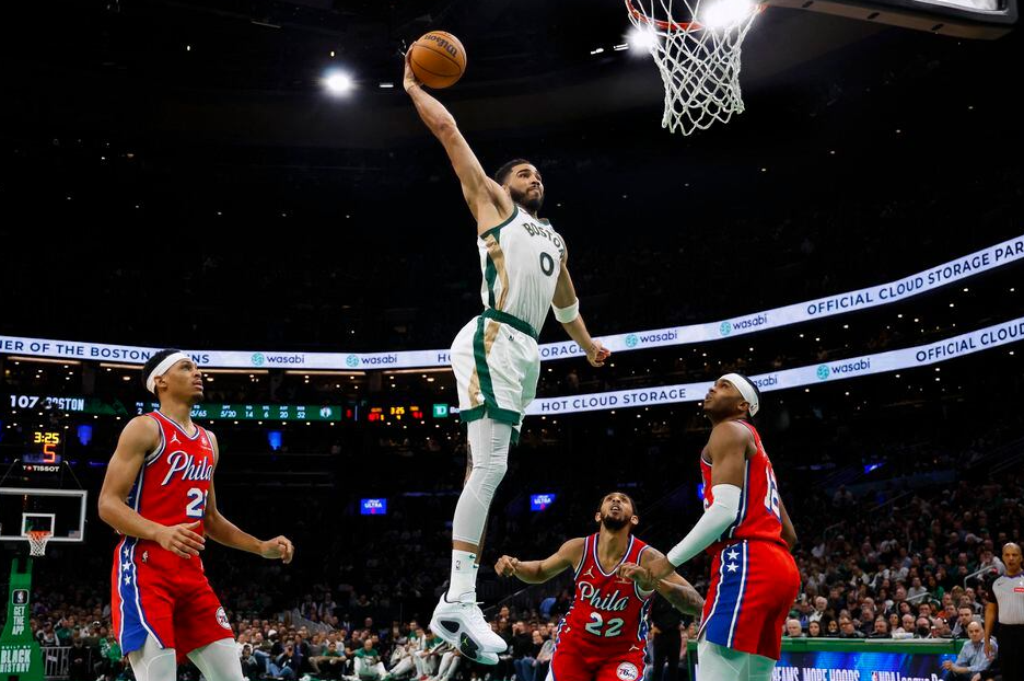 Boston Celtics forward Jayson Tatum (0) goes in for a dunk as Philadelphia 76ers forward Darius Bazley (25) and guard Ricky Council IV (16) look on during the second half at TD Garden in Boston, Massachusetts, Feb. 27, 2024.