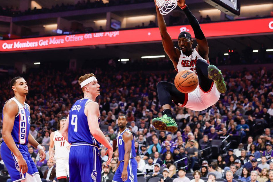 Miami Heat center Bam Adebayo (13) dunks the ball against Sacramento Kings guard Kevin Huerter (9) during the first quarter at Golden 1 Center in Sacramento, California, Feb. 26, 2024.