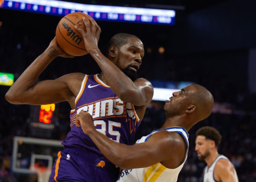 Phoenix Suns forward Kevin Durant (35) looks to drive over Golden State Warriors guard Chris Paul (3) during the first quarter at Chase Center in San Francisco, California, Oct. 24, 2023.