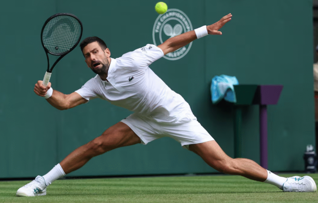 Novak Djokovic in action during his third-round Wimbledon match against fellow Serbian Miomir Kecmanovic at the All England Lawn Tennis and Croquet Club in London, Britain on July 5, 2025.