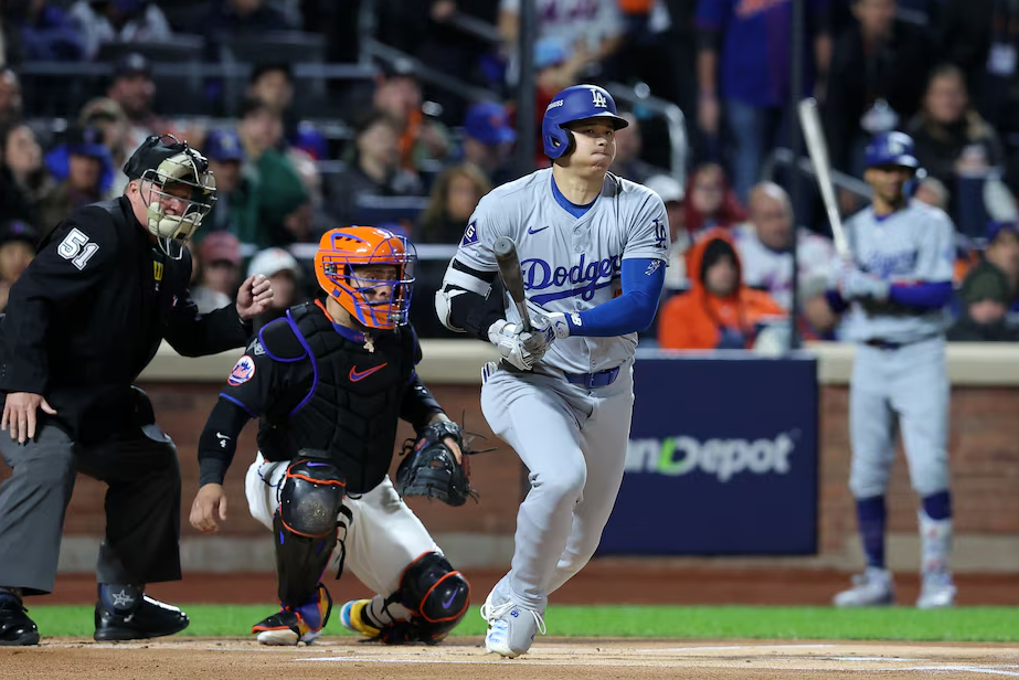Los Angeles Dodgers designated hitter Shohei Ohtani (17) grounds out in the first inning during game three of the NLCS for the 2024 MLB playoffs at Citi Field in New York City, Oct. 16, 2024.