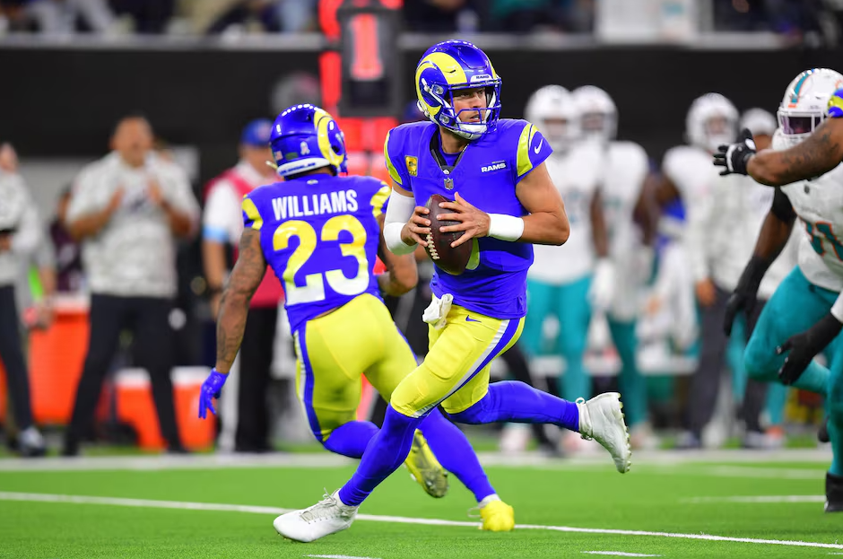 Los Angeles Rams quarterback Matthew Stafford (9) moves out to pass during the first half at SoFi Stadium in Inglewood, California, Nov. 11, 2024.