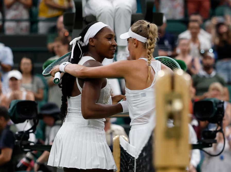 Ukraine's Dayana Yastremska and Coco Gauff of the U.S. embrace after their first-round Wimbledon match at All England Lawn Tennis and Croquet Club in London, Britain on July 1, 2025.REUTERS
