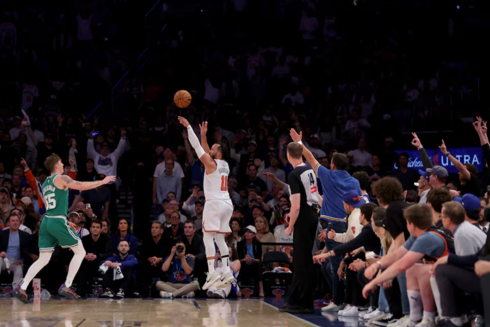 New York Knicks guard Jalen Brunson (11) shoots a three-point shot against Boston Celtics forward Baylor Scheierman (55) during the fourth quarter of game six in the second round of the 2025 NBA Playoffs at Madison Square Garden in New York, May 16, 2025.