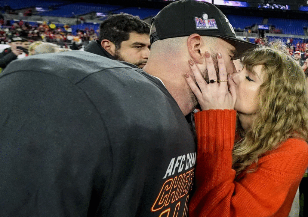 Taylor Swift kisses Kansas City Chief tight end Travis Kelce after his team defeated the Baltimore Ravens, Sunday, Jan. 28, 2024 in Baltimore.