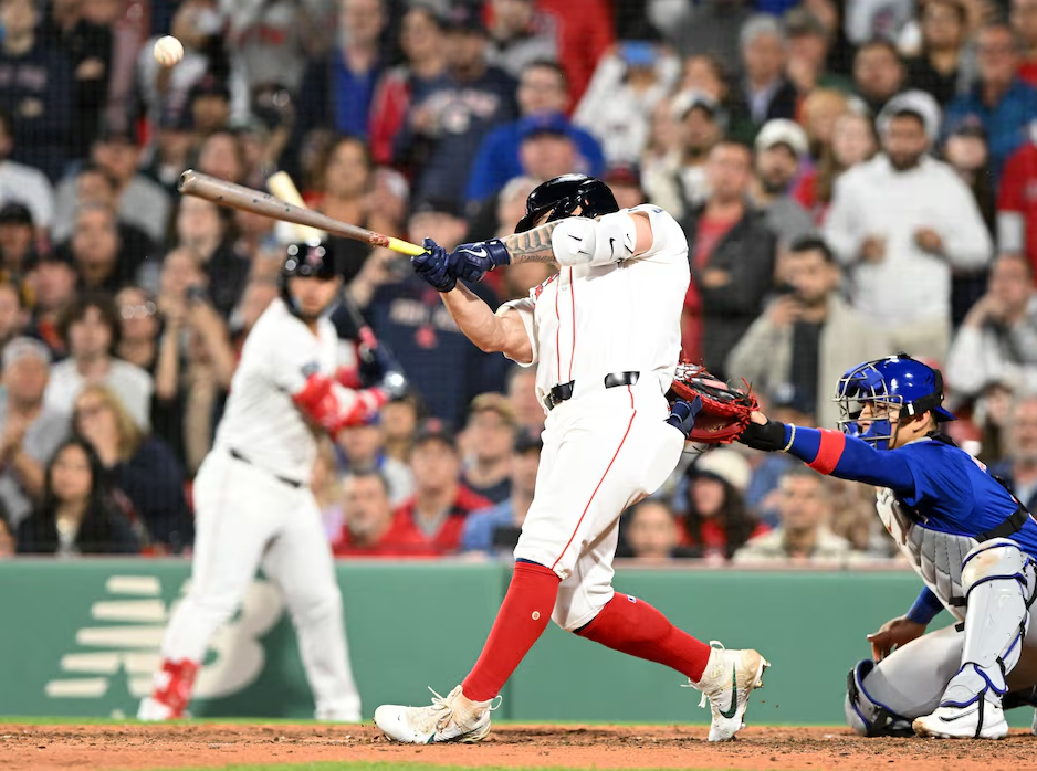 Boston Red Sox right fielder Tyler O'Neill (17) hits the game winning RBI against the Chicago Cubs during the ninth inning at Fenway Park in Boston, Massachusetts, April 28, 2024.
