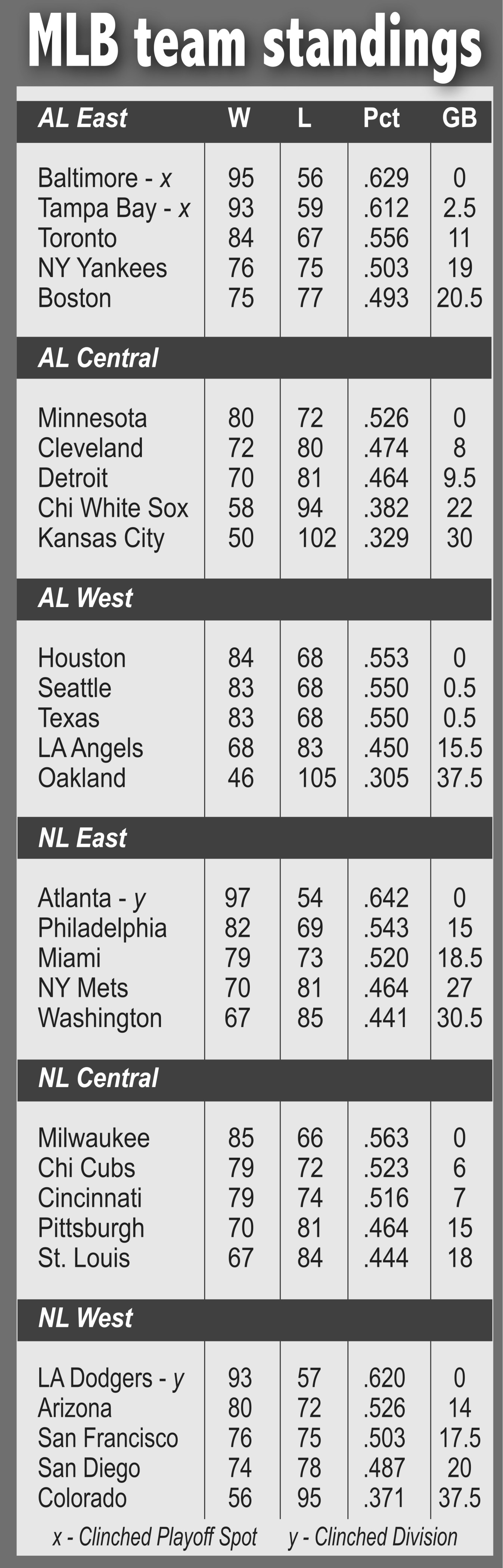 The Orioles maintained their 2 1/2-game lead over the Tampa Bay Rays in the American League East and reduced their magic number to clinch their first division title since 2014 to eight. The Astros now lead Texas and Seattle by only a half-game.