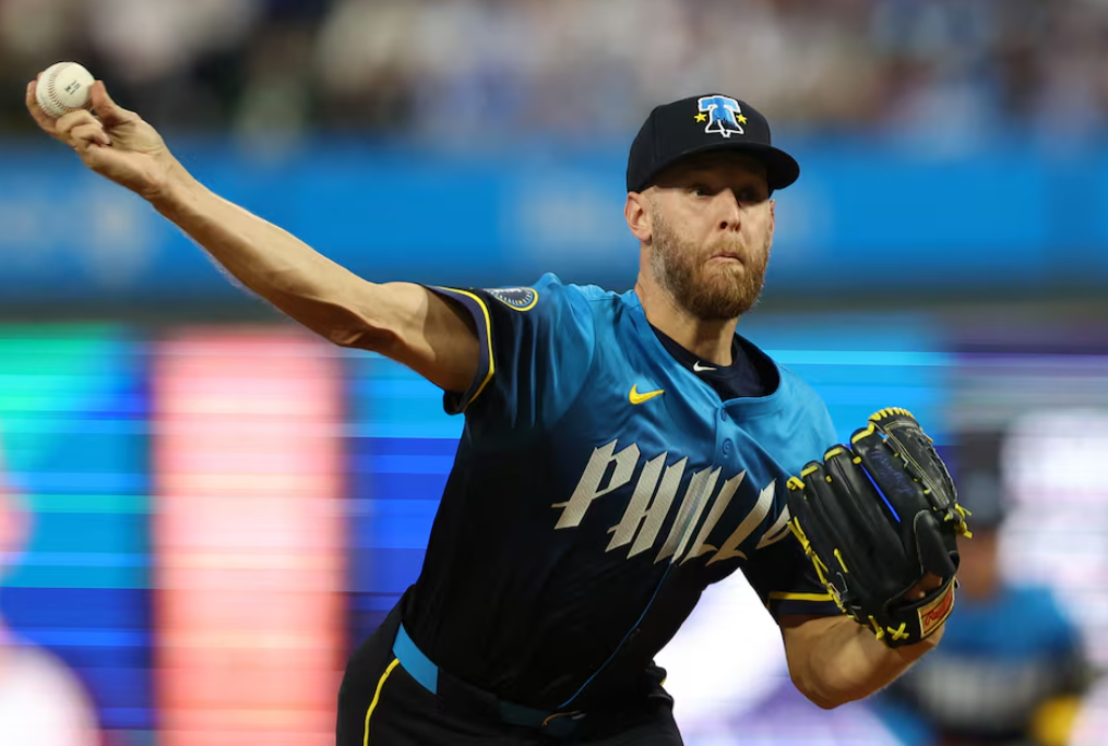 Philadelphia Phillies pitcher Zack Wheeler (45) throws a pitch during the fourth inning against the Miami Marlins at Citizens Bank Park in Philadelphia, Pennsylvania, April 18, 2025.