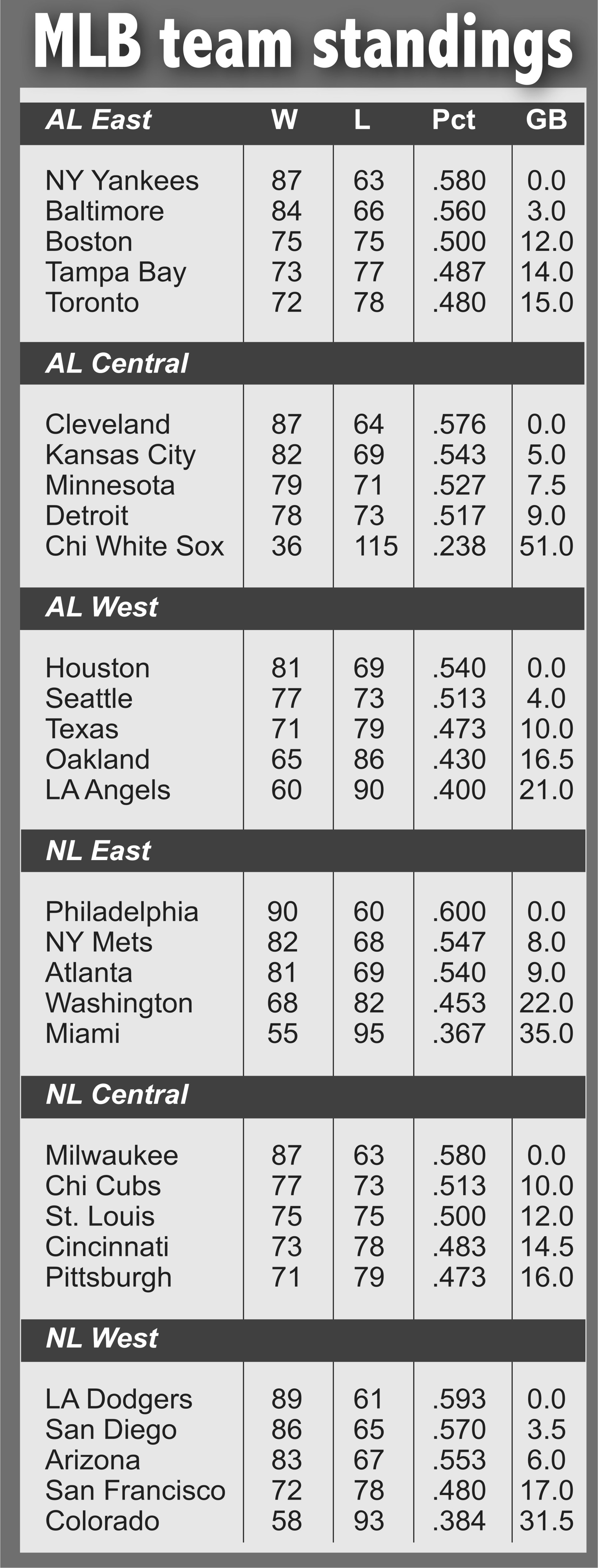 Milwaukee’s magic number to clinch the National League Central dropped to two. Civale (7-8) exited after allowing consecutive singles by Kyle Schwarber and Trea Turner to open the sixth. He walked one and fanned six in his outing. Colin Rea, who has made 25 starts this season, held the Phillies scoreless for the final 2 2/3 innings to earn his first career save.