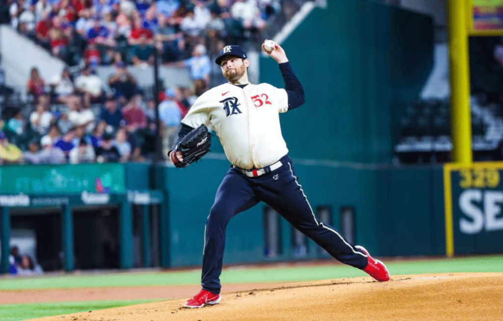Texas Rangers starting pitcher Jordan Montgomery (52) throws during the first inning against the Seattle Mariners at Globe Life Field in Arlington, Texas, Sept. 23, 2023.