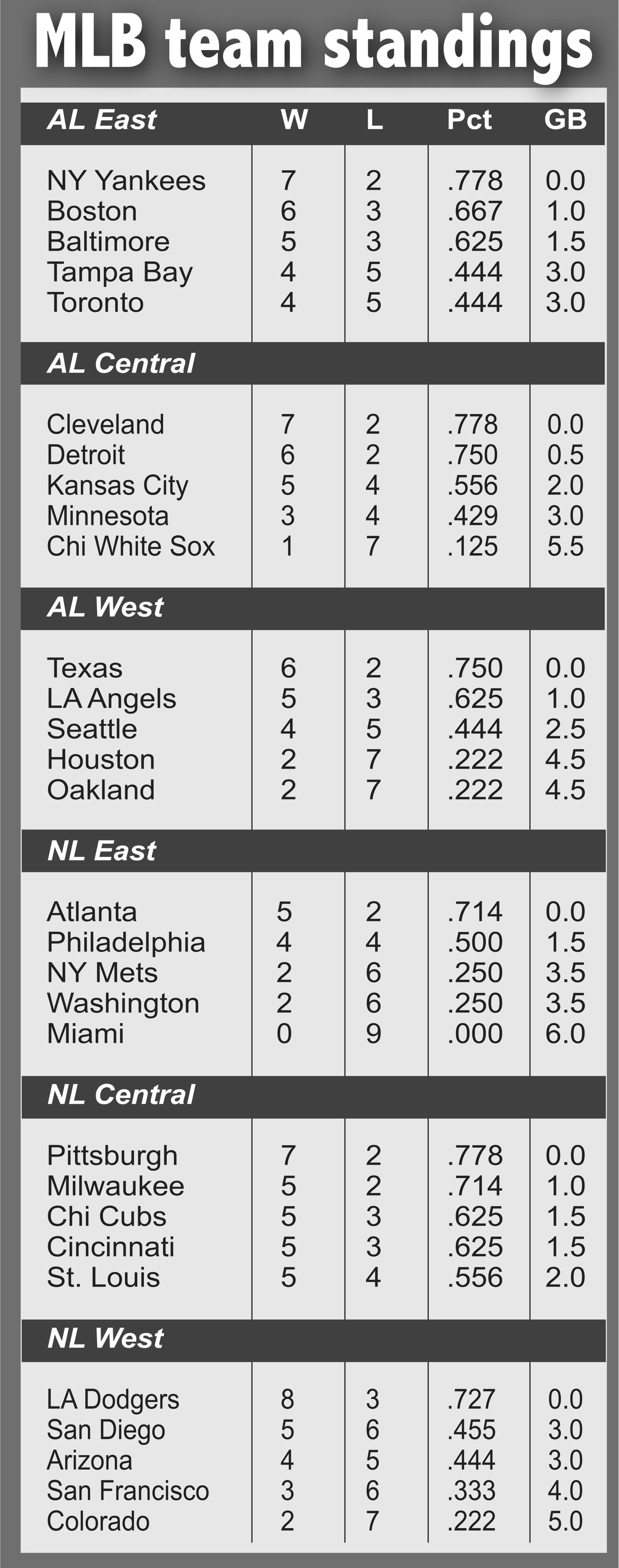 Jose Altuve had three hits for Houston, which stranded 10 baserunners and has lost seven of its first nine games of the season. Astros starter J.P. France (0-1) gave up three runs on eight hits over 5 2/3 innings.