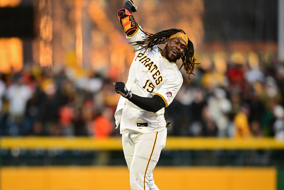 Pittsburgh Pirates shortstop Oneil Cruz (15) celebrates after hitting a game winning walk off single during the eleventh inning against the Baltimore Orioles at PNC Park in Pittsburgh, Pennsylvania, April 6, 2024.