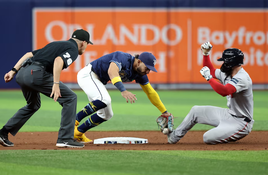 Tampa Bay Rays shortstop José Caballero (7) drops the ball as Boston Red Sox catcher Connor Wong (12) slides safe into second base during the ninth inning at Tropicana Field in St. Petersburg, Florida, May 20, 2024.