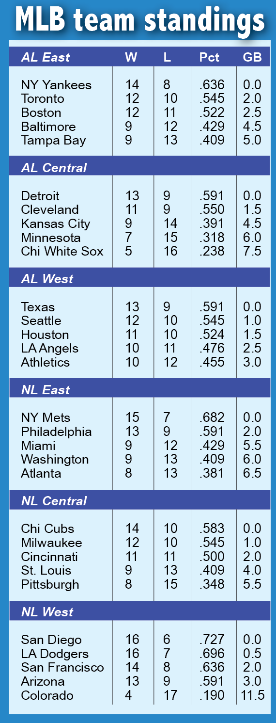 The Tiges’ Tarik Skubal, who didn’t give up a run in his previous two starts, allowed two runs and seven hits in five innings. He struck out four and walked one. Zach McKinstry had three hits and two RBIs and Kerry Carpenter supplied three hits with an RBI for Detroit.
