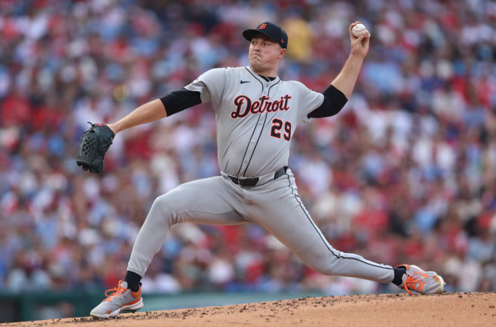 Detroit Tigers pitcher Tarik Skubal (29) throws a pitch against the Philadelphia Phillies during the second inning at Citizens Bank Park in Philadelphia, Pennsylvania on Aug. 2, 2025.
