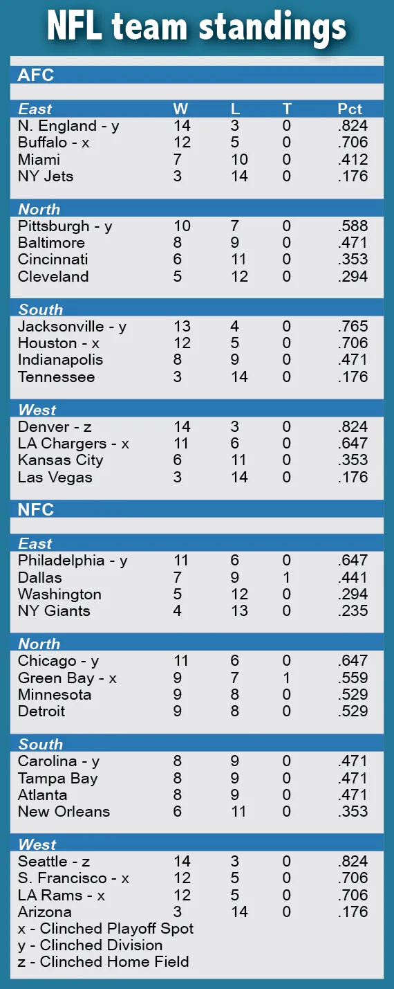 Rookie TreVeyon Henderson rushed for two touchdowns for New England, which amassed 243 yards on the ground to cap its sixth 14-win season in franchise history. The Patriots (14-3) settled for the No. 2 seed in the AFC playoffs after Denver secured the lone first-round bye by defeating the Los Angeles Chargers; New England will host the seventh-seeded Chargers next weekend in the AFC wild-card round.