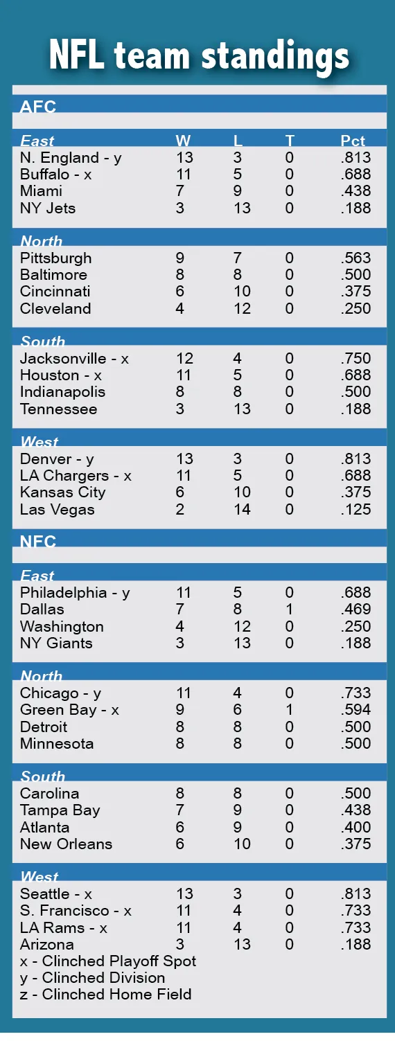 Drake Maye completed 19 of 21 passes for 256 yards and five touchdowns to lead New England past New York in East Rutherford, N.J. Coupled with Buffalo’s 13-12 loss to Philadelphia later in the day, the Patriots clinched the AFC East crown for the first time since 2019.