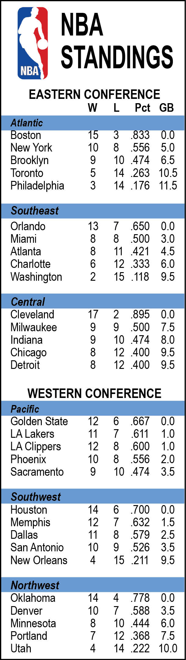 Rookie Alexandre Sarr had his third straight double-figure-point scoring game for Washington, finishing with 13 points. Malcolm Brogdon and Jonas Valanciunas shared the Wizards’ team high with 17 points.