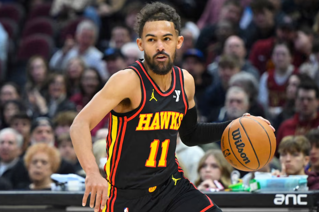Atlanta Hawks guard Trae Young (11) brings the ball up court in the first quarter against the Cleveland Cavaliers at Rocket Mortgage FieldHouse in Cleveland, Ohio, Nov. 27, 2024.