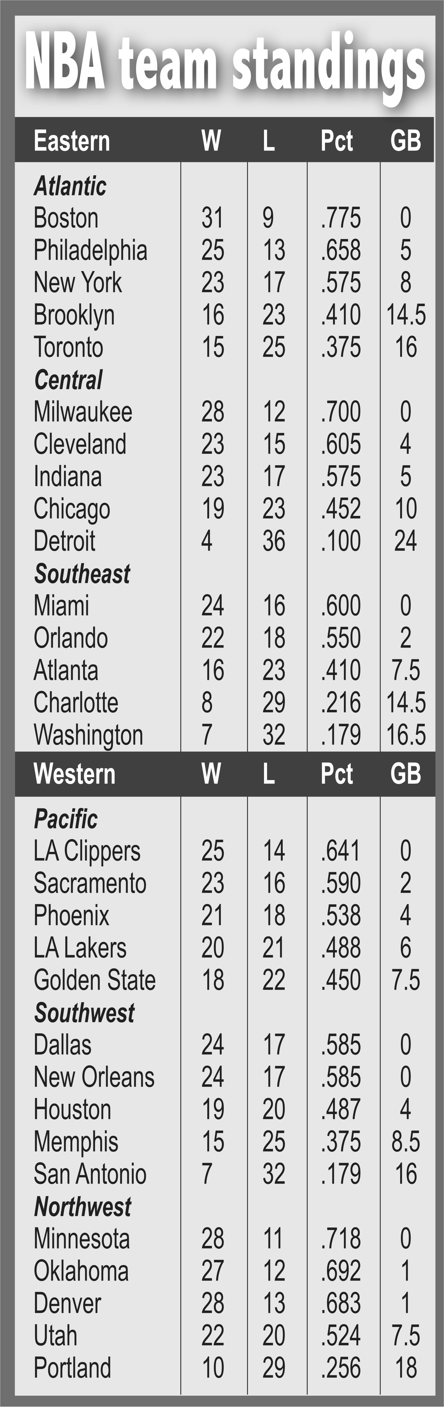 Detroit came into the matchup winless since snapping its previous losing skid, an NBA-record 28 straight, and without a road victory since beating Charlotte on Oct. 27. The Pistons enjoyed advantages of 25-15 in second-chance points and 60-46 in points in the paint.