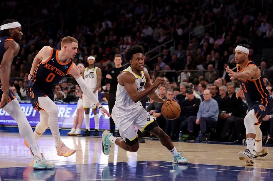 Utah Jazz guard Collin Sexton (2) drives to the basket against New York Knicks forward Precious Achiuwa (5) and guards Donte DiVincenzo (0) and Josh Hart (3) during the third quarter at Madison Square Garden in New York, Jan. 30, 2024.