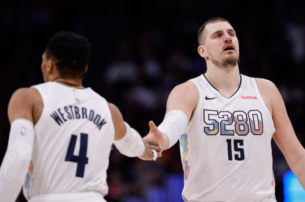 Denver Nuggets center Nikola Jokic (15) and guard Russell Westbrook (4) in the third quarter against the Philadelphia 76ers at Ball Arena in Denver, Colorado, Jan. 21, 2025.