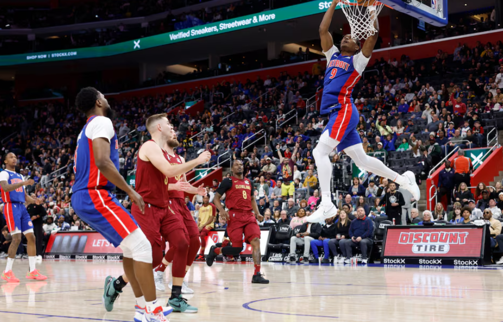 Detroit Pistons forward Ausar Thompson (9) dunks in the first half against the Cleveland Cavaliers at Little Caesars Arena in Detroit, Michigan, March 28, 2025.