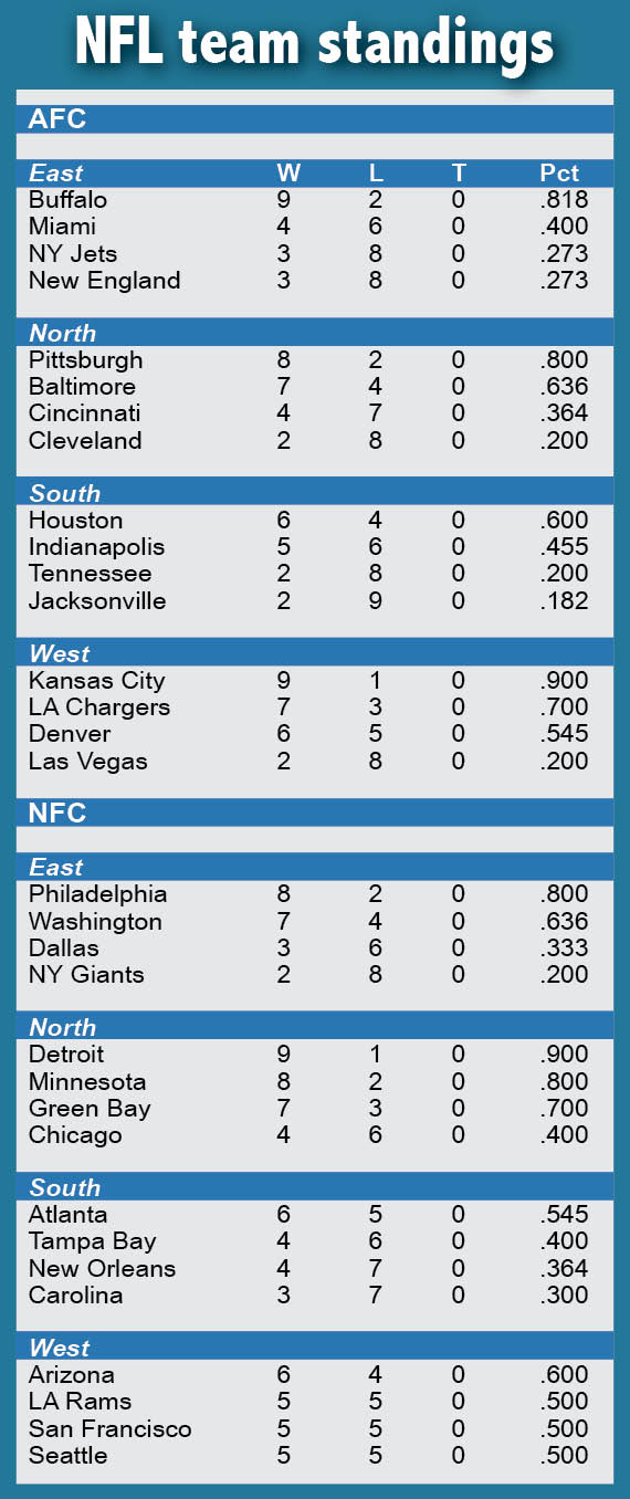 Allen completed 27 of 40 passes for 262 yards and led the Bills (9-2) with 55 rushing yards.