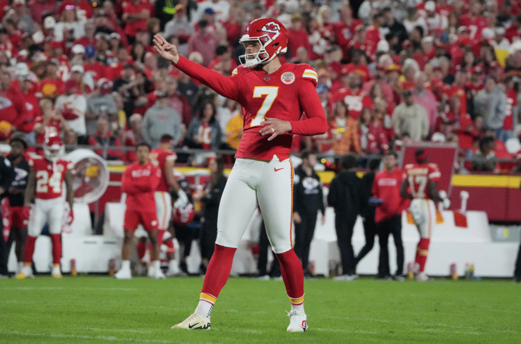 Kansas City Chiefs place kicker Harrison Butker (7) prepares to kick a field goal against the New Orleans Saints during the game at GEHA Field at Arrowhead Stadium in Kansas City, Missouri, Oct 7, 2024.
