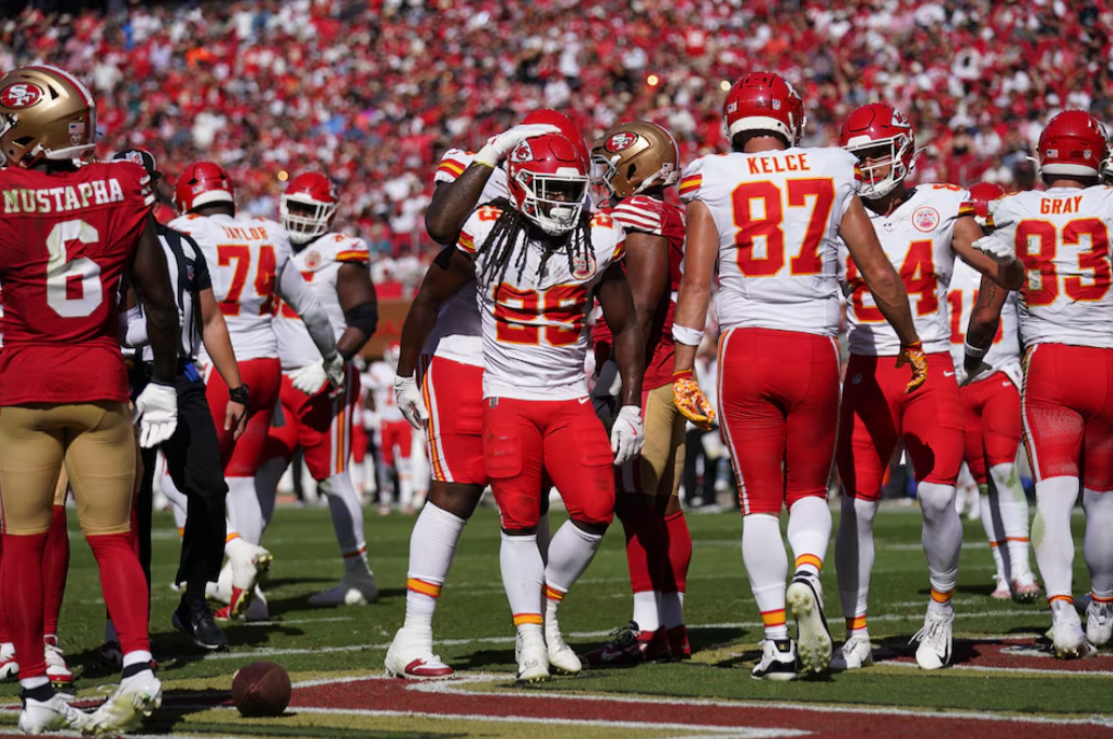 Kansas City Chiefs running back Kareem Hunt (29) celebrates after scoring a touchdown against the San Francisco 49ers in the second quarter at Levi’s Stadium in Santa Clara, California, Oct. 20, 2024.