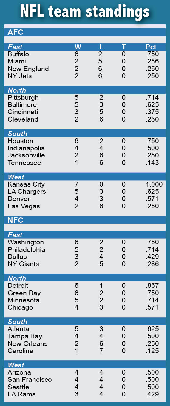 Travis Kelce had 10 catches for 90 yards and a touchdown for the Chiefs (7-0), who are the NFL’s last unbeaten team this season. Kareem Hunt added a touchdown on the ground and Xavier Worthy had a TD catch.