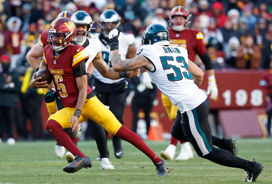 Washington Commanders quarterback Jayden Daniels (5) runs with the ball as Philadelphia Eagles linebacker Zack Baun (53) chases during the third quarter at Northwest Stadium in Landover, Maryland, Dec. 23, 2024.