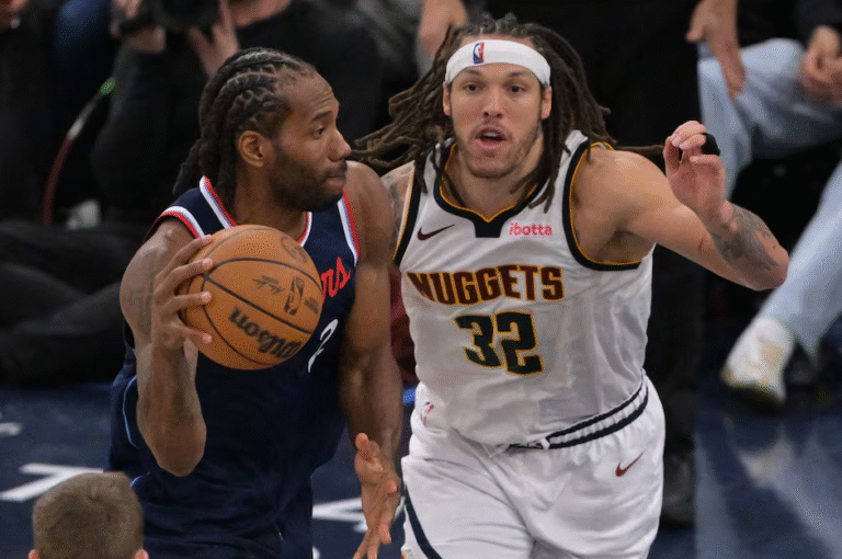 Los Angeles Clippers forward Kawhi Leonard (2) is defended by Denver Nuggets forward Aaron Gordon (32) in the second half of game four of round one of the 2024 NBA Playoffs at Intuit Dome in Inglewood, California, April 26, 2025. Photo by Jayne Kamin/Oncea-Imagn Images (Reuters) — Aaron Gordon slam…