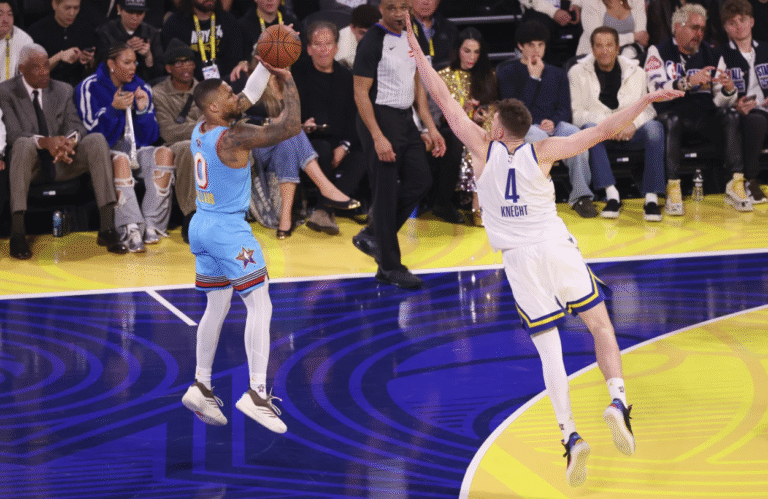 Milwaukee Bucks Damian Lillard shoots over Los Angeles Lakers forward Dalton Knecht during the NBA All-Star game Sunday, Feb. 16, 2025, in San Francisco. SAN FRANCISCO (AP) — It’ll be Shaq’s OGs against Chuck’s Global Stars for the All-Star mini-tournament title. The OGs got into the final with a w…