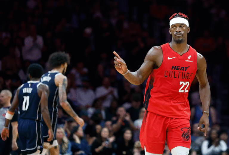 Miami Heat forward Jimmy Butler (22) reacts against the Dallas Mavericks during the second half at Kaseya Center in Miami, Florida, Nov. 24, 2024. (Reuters) — Jimmy Butler scored a game-high 33 points and added nine rebounds and six assists as the host Miami Heat defeated the Dallas Mavericks 123-1…
