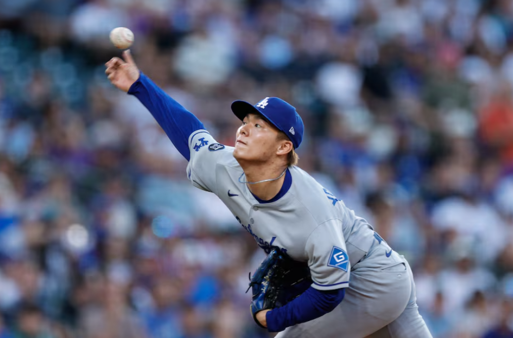 Los Angeles Dodgers starting pitcher Yoshinobu Yamamoto (18) pitches in the second inning against the Colorado Rockies at Coors Field in Denver, Colorado, Aug. 18, 2025.