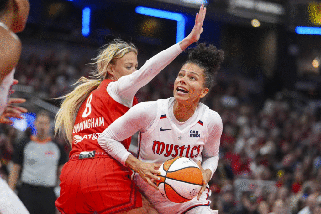 Washington Mystics forward Alysha Clark looks to shoot around Indiana Fever guard Sophie Cunningham in the second half of a WNBA game in Indianapolis, Friday, Aug. 15, 2025AP