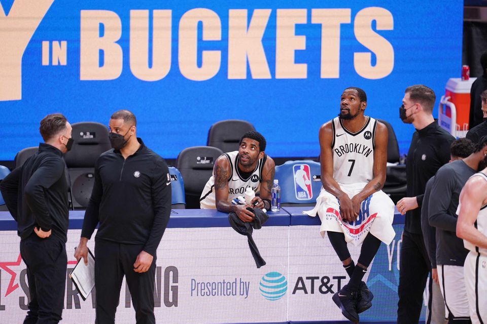 Brooklyn Nets guard Kyrie Irving (11) and forward Kevin Durant (7) rest near the team bench during a timeout against the Golden State Warriors in the fourth quarter at the Chase Center in San Francisco, California on Feb. 13, 2021.