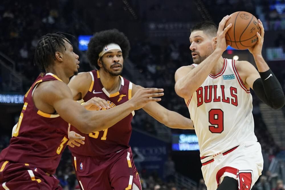 Chicago Bulls’ Zach LaVine (8) drives past Cleveland Cavaliers’ Isaac Okoro (35) and Jarrett Allen (31) in the first half of an NBA basketball game, Dec. 8, 2021, in Cleveland.