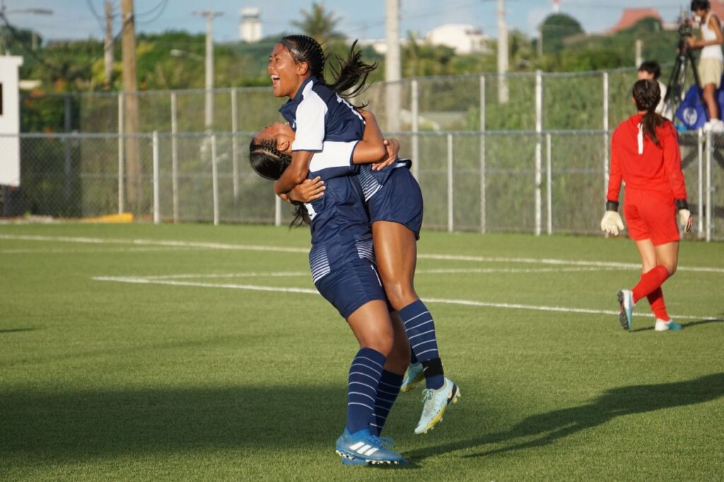 NMI U23 women’s national team players Jerlyn Castillo and Kaithlyn Chavez celebrate after the latter scored a goal against Guam in a Marianas Cup game Thursday at the NMI Soccer Training Center in Koblerville. The NMI women won, 5-1, but the NMI men lost to their Guam counterparts, 0-1. More details to follow.