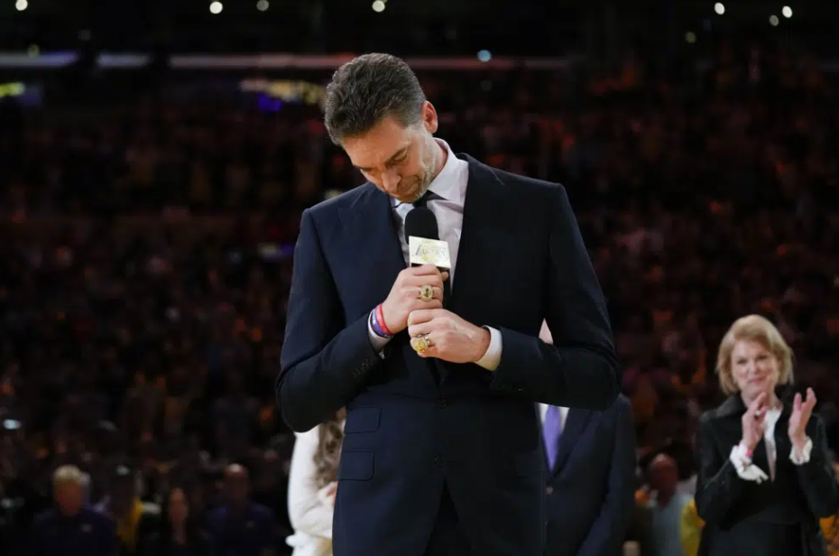 Gasol’s banner was unveiled during a halftime ceremony that began with Bryant’s widow, Vanessa, introducing a video in which an excited Kobe said he was looking forward to the day when Gasol gave a speech at center court during his jersey retirement. Gasol choked up while watching the video and standing in that exact spot, wiping tears from his eyes before he spoke to the crowd.