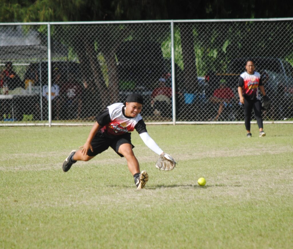 Queens of Diamonds’ Kiana Aldan reaches for the grounder during a 2022 Budweiser Belau Amateur Softball League game at the Dandan baseball field.