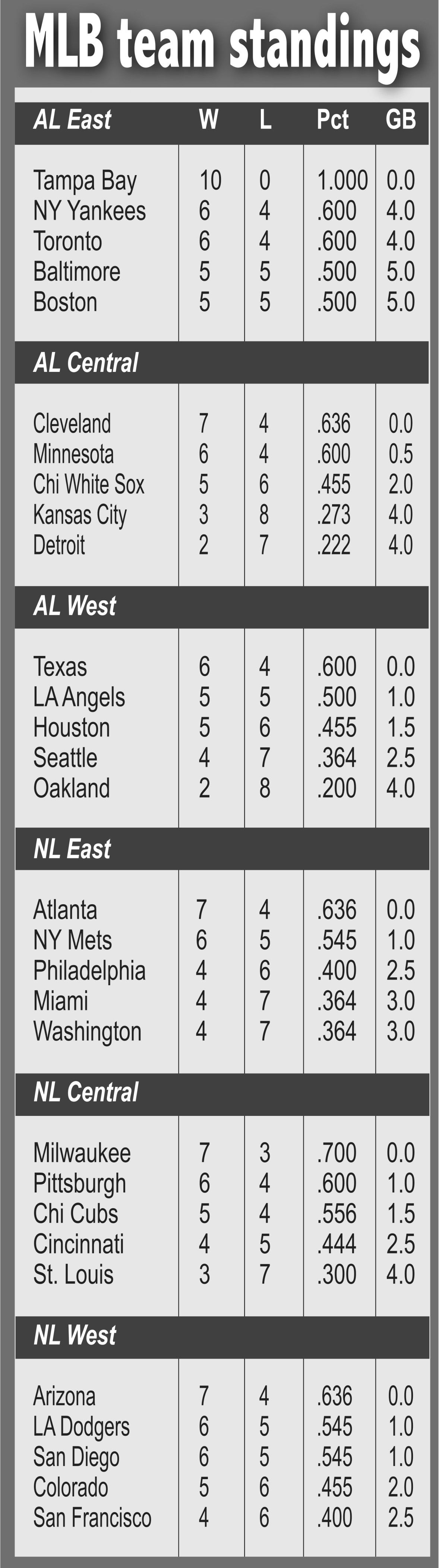 ST. PETERSBURG, Fla. (AP) — The Tampa Bay Rays became the first major league team since the 1987 Milwaukee Brewers to open the season with 10 straight wins, getting a solo homer from Brandon Lowe in the eighth inning to beat the Boston Red Sox 1-0 on Monday night.