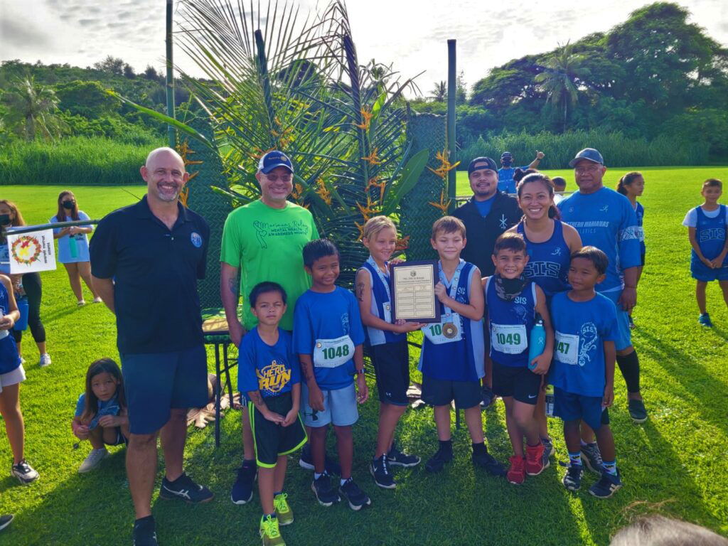 The Saipan International School elementary boys pose with their championship trophy during the awards ceremony of the NMA-PSS All School Cross Country Saturday at the Saipan Country Club.
