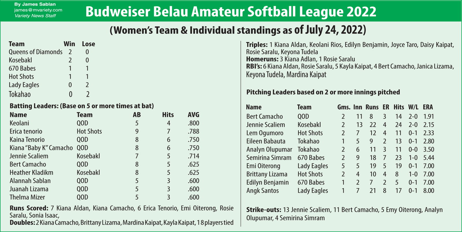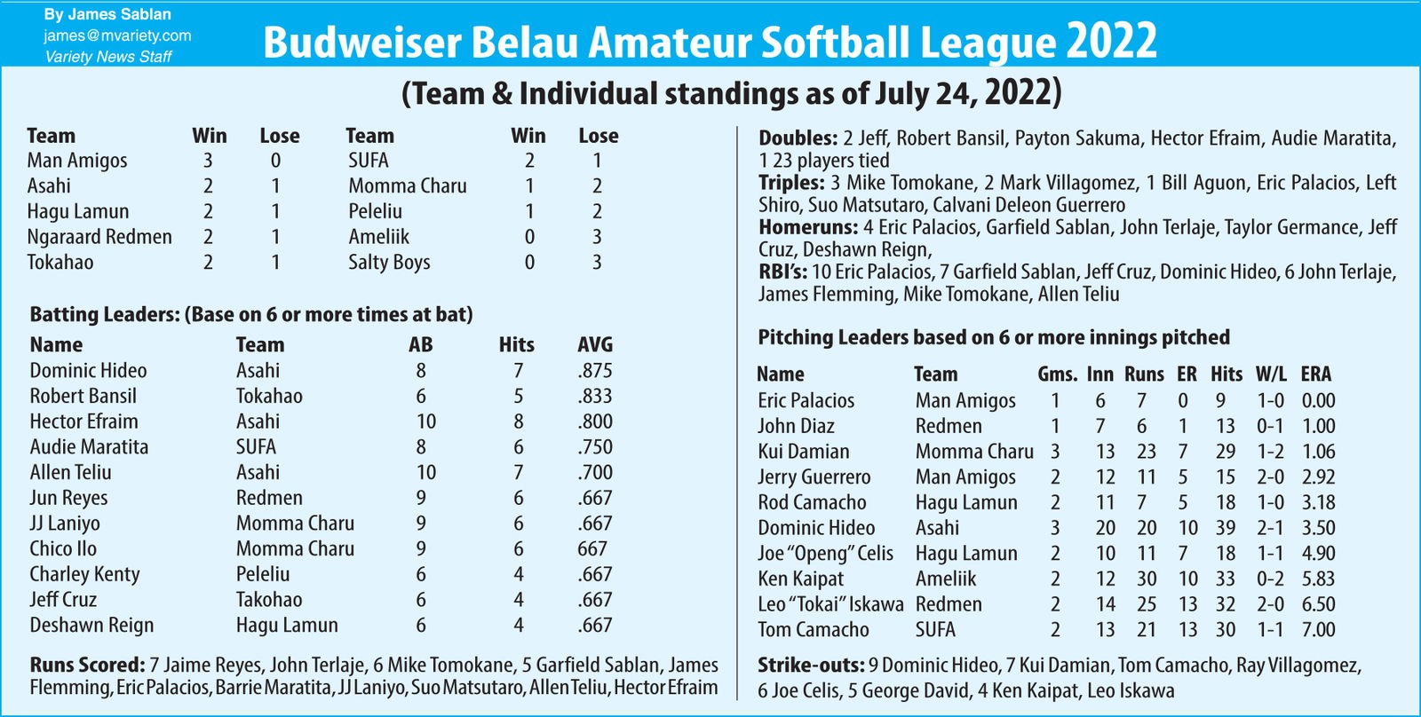 THE MAN Amigos remain the top team of the Budweiser Belau Amateur Softball League 2022 after defeating the Ngaraard Redmen, 9-3, Sunday at the Dandan baseball field. It was the Man Amigos’ fourth straight victory.