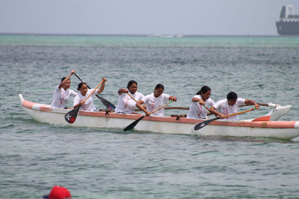The girls of Kagman High School push for the first place finish in the 1000m distance of the PSS Interscholastic Outrigger Race Series Saturday at Kilili Beach.
