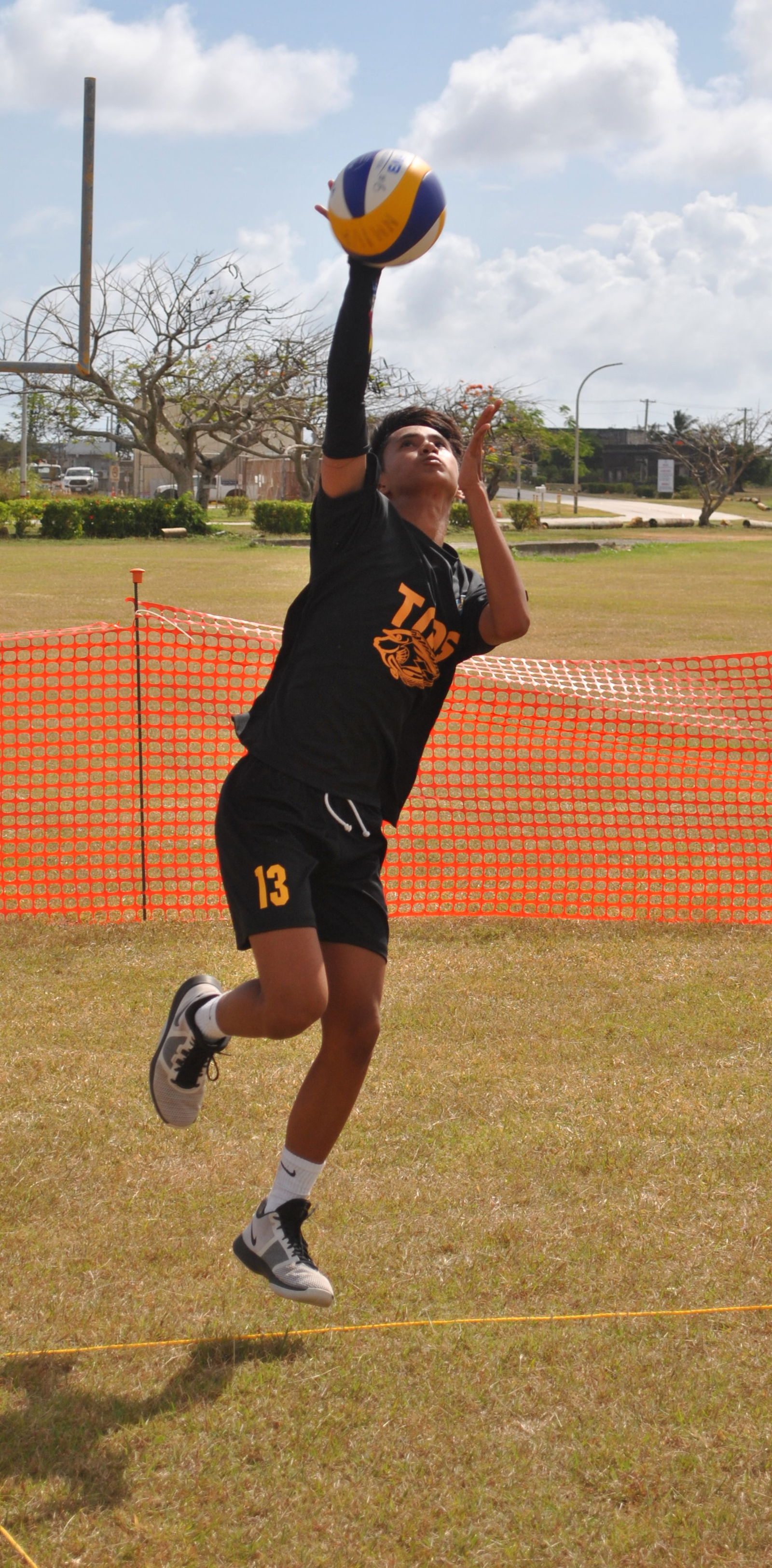 Tanapag Middle School’s Jerome Manzon connects the overhead serve during a PSS 4v4 Boys Grass Volleyball League game at the CPA Airport Field on Monday.