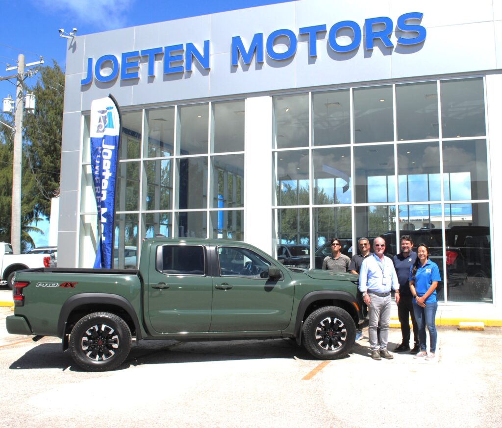 Joeten Motors has donated a 2022 Nissan Frontier Pro 4X as hole-in-one prize for hole #11 at the VISA Marianas Golf Classic this Saturday at Laolao Bay Golf & Resort. The fundraising tournament will benefit the Make-A-Wish Foundation. Photo shows Joeten Motors 2nd VP Peter Tenorio, Sales Manager Boss Alvarez, IT&E Enterprise Sales Manager Hans Mickelson, Joeten Motors 1st VP Matt Deets and Joeten Chief Financial Officer Somia Quan.
