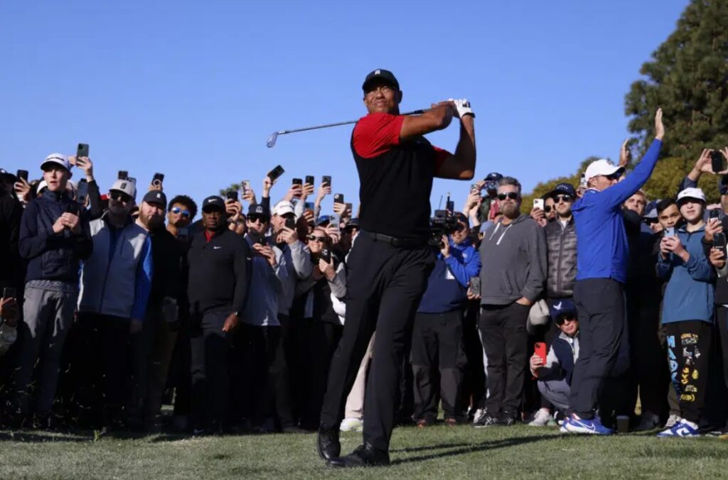 Tiger Woods hits his approach shot off the fairway on the first hole during the final round of the Genesis Invitational golf tournament at Riviera Country Club, Sunday, Feb. 19, 2023, in the Pacific Palisades area of Los Angeles.