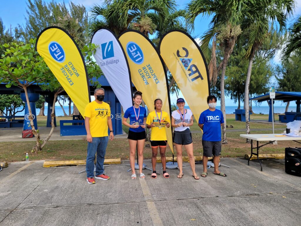 With their trophies and medals, 7th Aquathon women winners Jinnie Thompson, Kaithlyn Chavez and Nash Lindsay pose for a photo with Triathlon Association of the CNMI officials